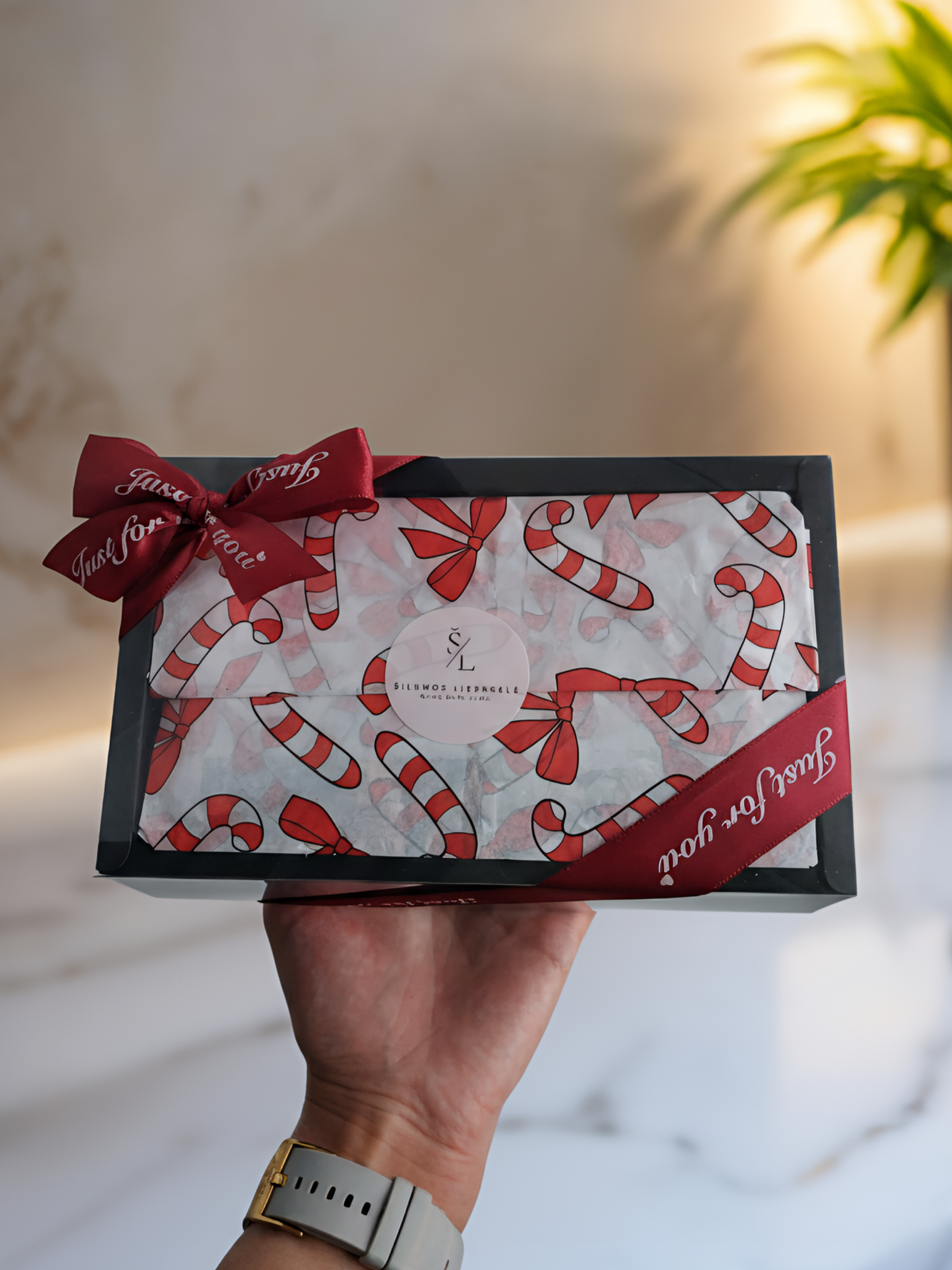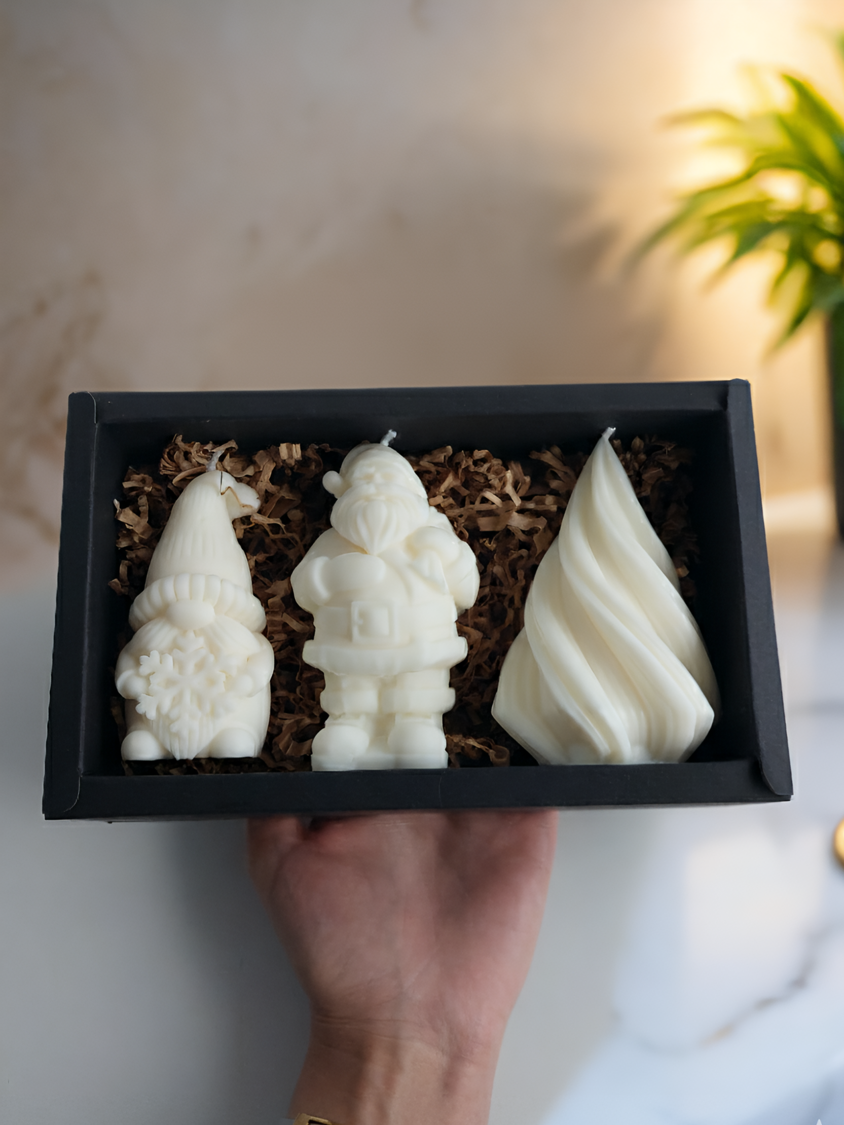 Rankų darbo žvakės iš natūralaus sojų vaško su medivilninėmis dagtimis. Rinkinį sudaro 1vnt Eglė, 1vnt Kalėdų senelis, 1vnt nykštukas.