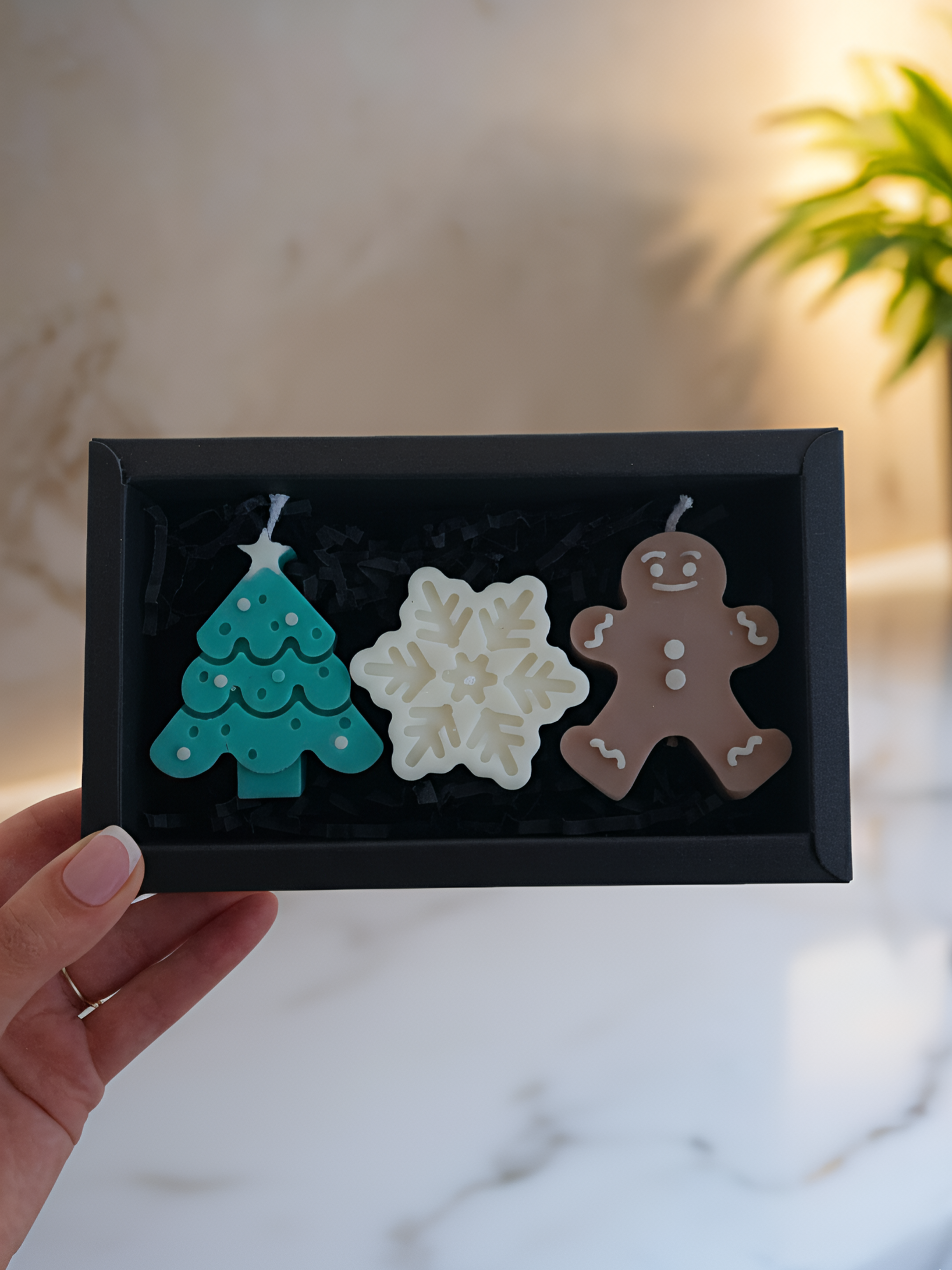 Rankų darbo žvakės iš natūralaus augalinio sojų vaško su medvilnine dagtimi. Rinkinį sudaro 1vnt snaigė,1vnt eglutė ir 1vnt sausainiukas. Supakuota kaip dovana!
