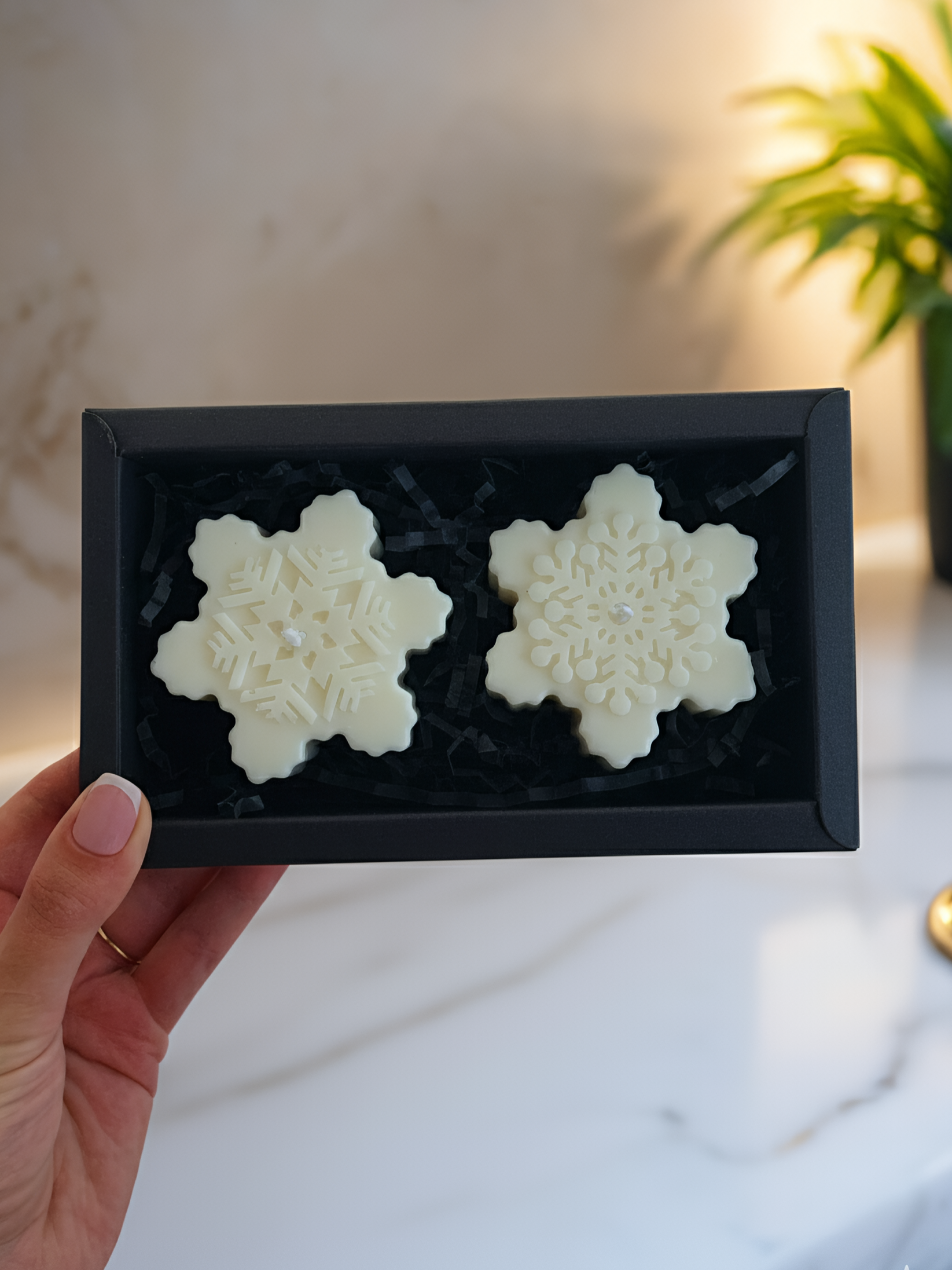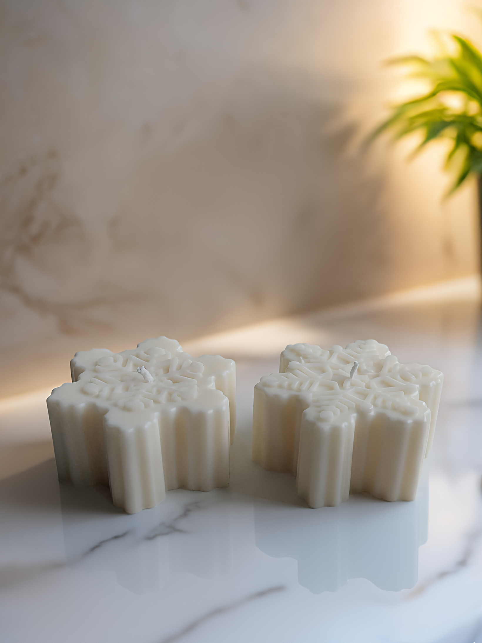 Rankų darbo žvakės iš natūralaus sojų vaško su medivilninėmis dagtimis. Rinkinį sudaro 2vnt žvakių - snaigės.
